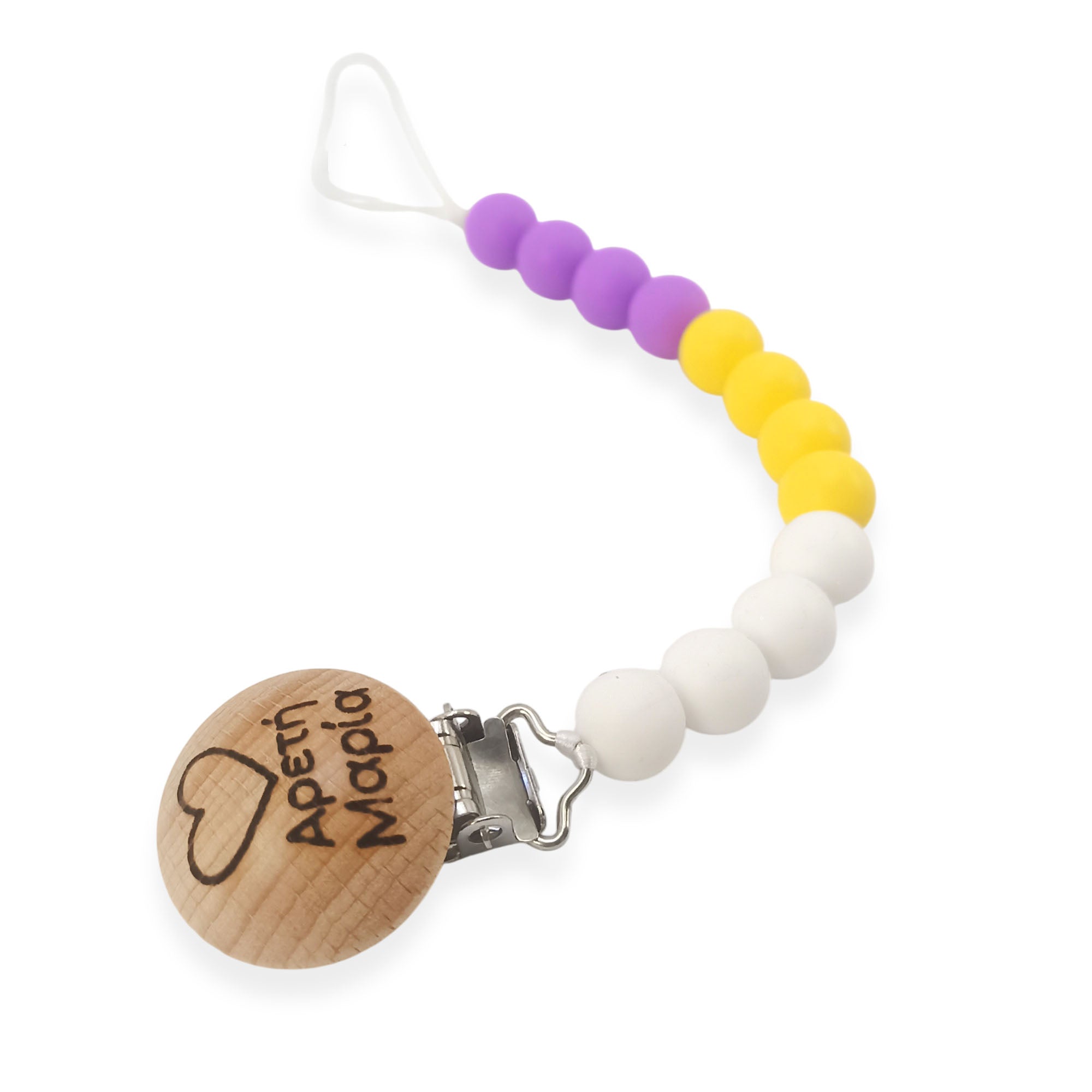 Φτιαγμένο με χάντρες σιλικόνης 🟣 και μεταλλικό κλιπ με ξύλινο διακοσμητικό κάλυμμα ασφαλείας 🌳🔒.