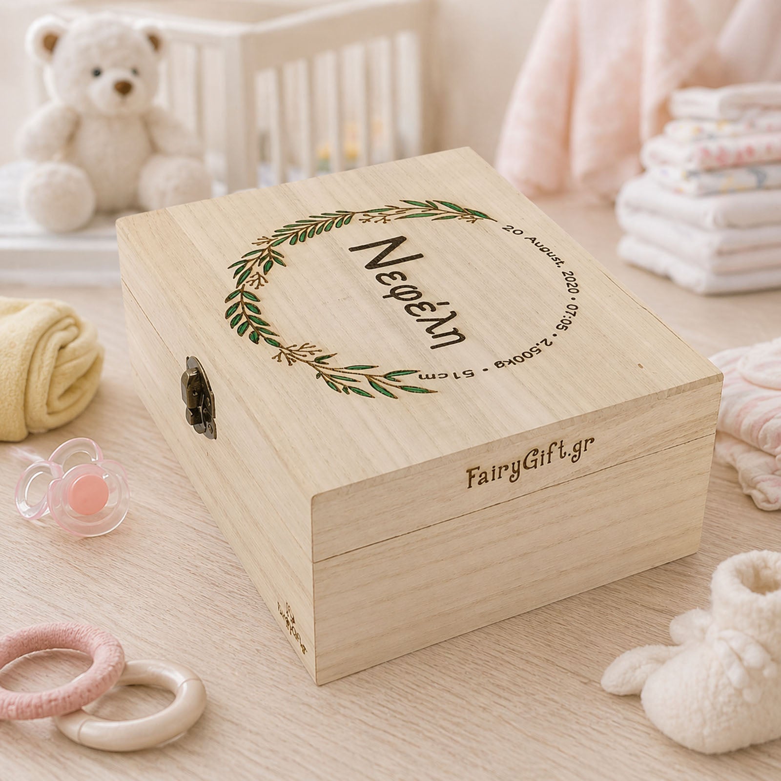 Με χαραγμένο το όνομα και τα στοιχεία γέννησης, γίνεται ένα προσωπικό κουτί αναμνήσεων που θα συνοδεύει το παιδί σου σε όλη του τη ζωή.